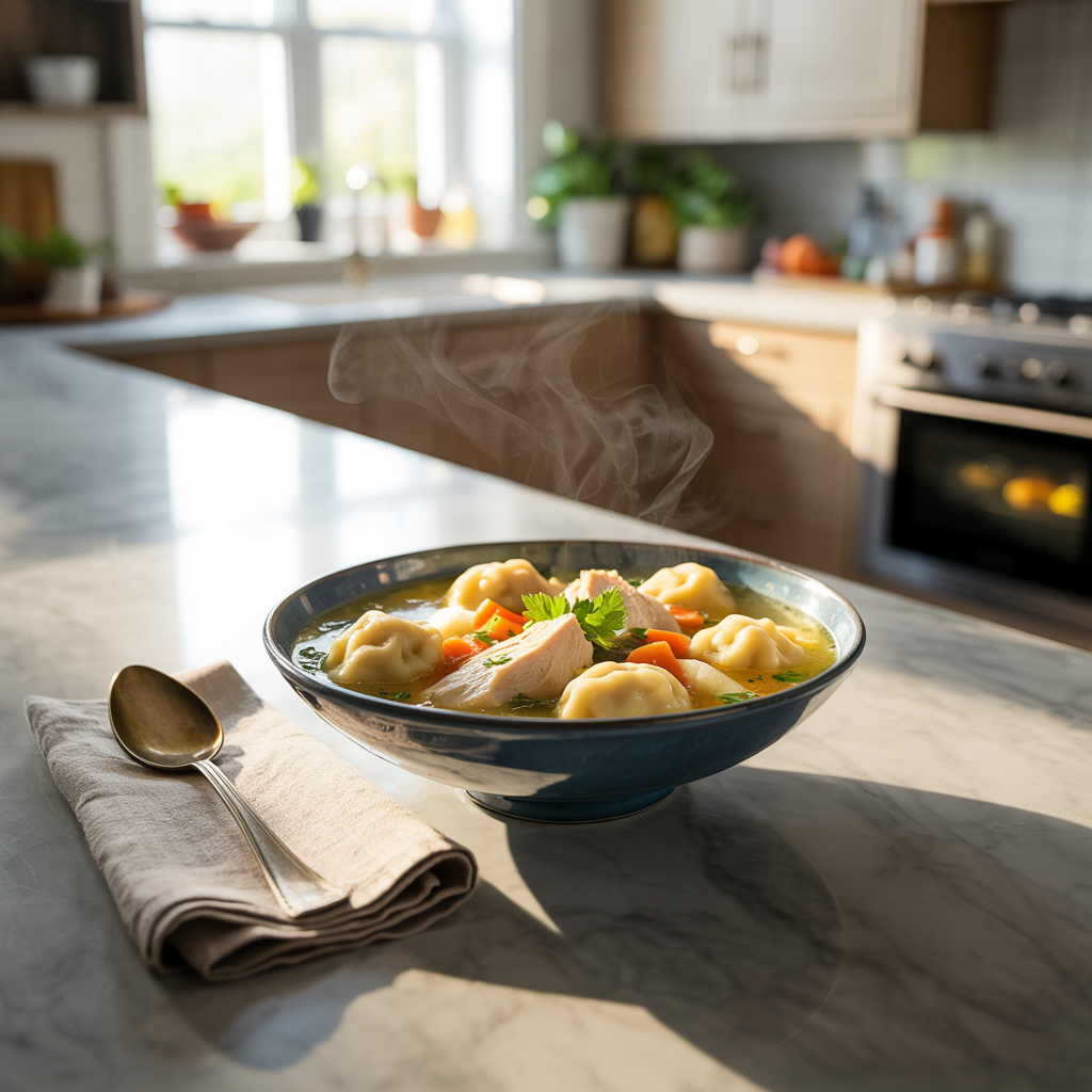 Boil water and butter in a heavy frying pan. Add flour and cook until the mixture leaves pan. Remove mixture into a large bowl. Add one egg at a time. Beat very well. Drop by the tablespoon into the hot chicken broth. Cook covered on medium heat for 20 minutes. Do not boil. Dumplings will be puffy and light. They will contract when lid is removed. Serve dumplings in salted broth.(2011 variation: Add 1/8 tsp salt to water when making dumplings; Add frozen peas to soup and garnish with cilantro.)
